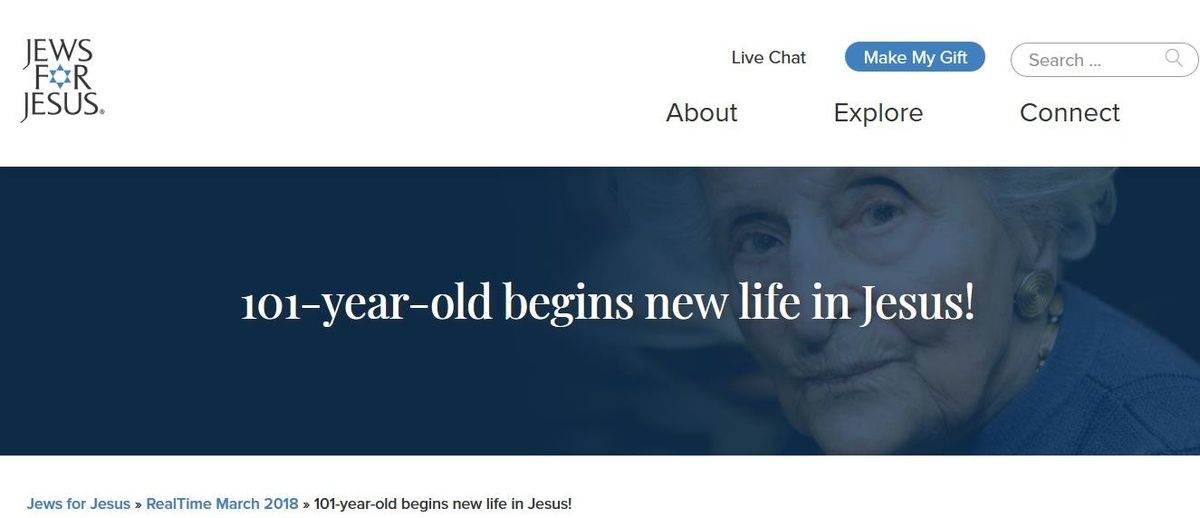 L'histoire véridique racontée le 1er mars retrace le travail de la missionnaire Susan Perlman, directrice adjointe des « Jews for Jesus», vivant à San Francisco, en Californie, qui a traversé le pays pour visiter Cynthia, une femme juive de 101 ans vivant à New York.