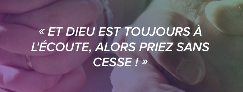 Tout au long de la Bible, Dieu ordonne à son peuple de prier en tout temps dans les bons comme dans les mauvais moments. Peu importe quelle est notre situation ou notre condition, nous devons prier sans cesse. “Soyez toujours joyeux. Priez sans cesse. Rendez grâces en toutes choses, car c’est à votre égard la volonté de Dieu en Jésus-Christ” (1 Thessaloniciens 5:16-18).